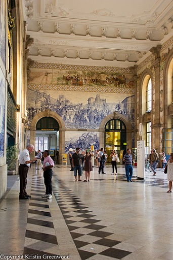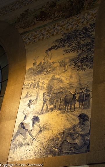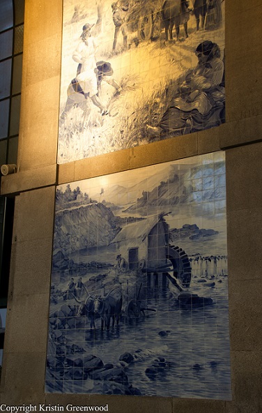 In der linken oberen Ecke sieht man plötzlich Azulejos, die berühmten handbemalten Fliesen, die einen Einblick in de Geschichte von Portugal beim Bahnhof São Bento geben.